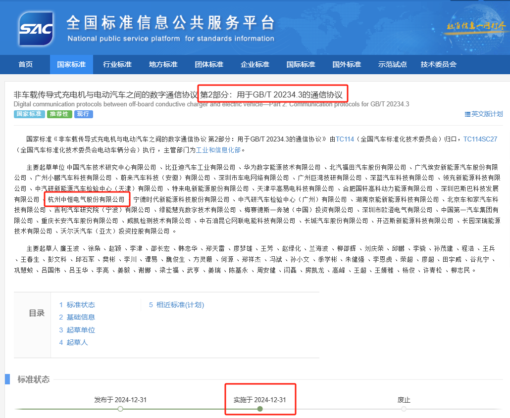 日前,國家市場監(jiān)督管理總局、國家標(biāo)準(zhǔn)化管理委員會正式發(fā)布兩項關(guān)于電動汽車充電的國家標(biāo)準(zhǔn),中恒電氣作為主要起草單位之一,為標(biāo)準(zhǔn)的制定貢獻了重要力量。